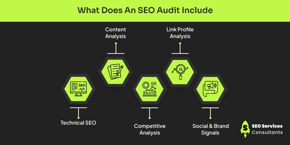 A modern SEO audit provide 360 degree evaluation of digital presence. It includes five key areas, such as technical SEO, content analysis, link profile analysis, and social brand signals.